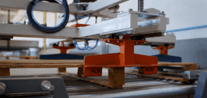 - Transportador automático: El palet reparado avanza por una línea de rodillos motorizados.